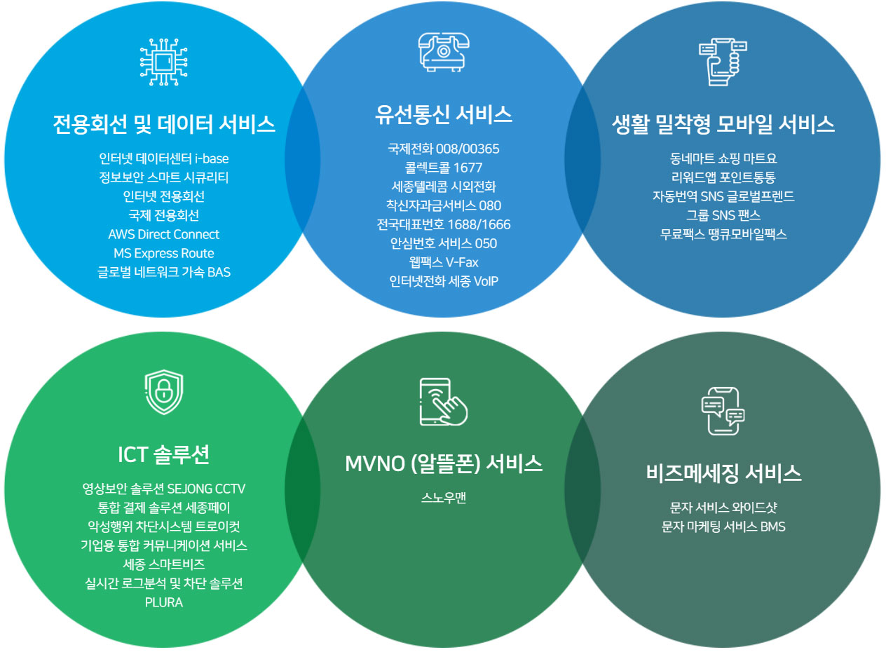유무선 통신서비스를 제공하는 한 편, 결제 솔루션 '세종페이', 보안 솔루션 '트로이컷' 등과 같이