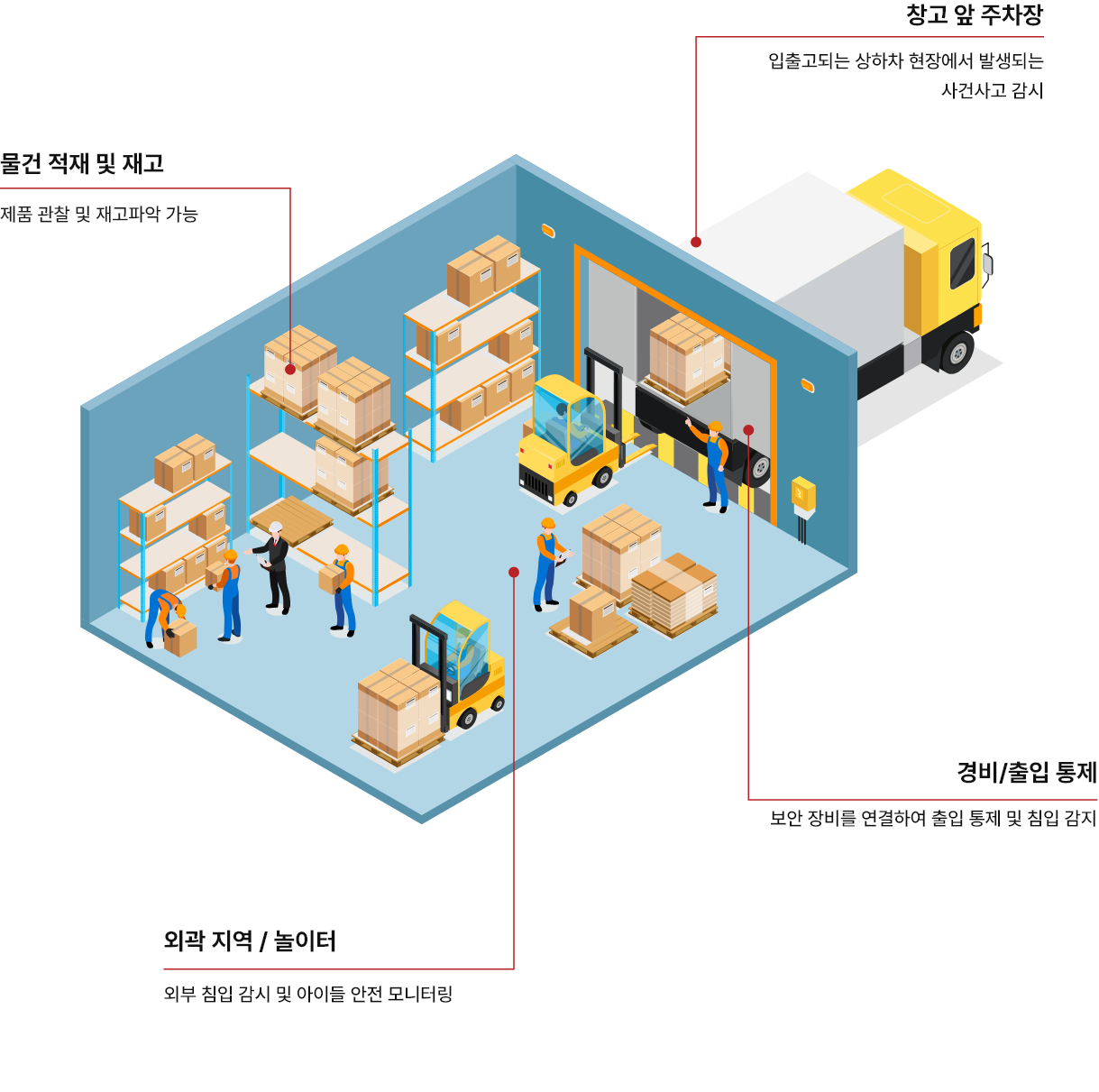 초고화질 카메라를 통해 공장 혹은 창고의 상황을 상시 모니터링 할 수 있으며, 원격제어를 통해 내.외부를 효과적으로 보호하는 서비스